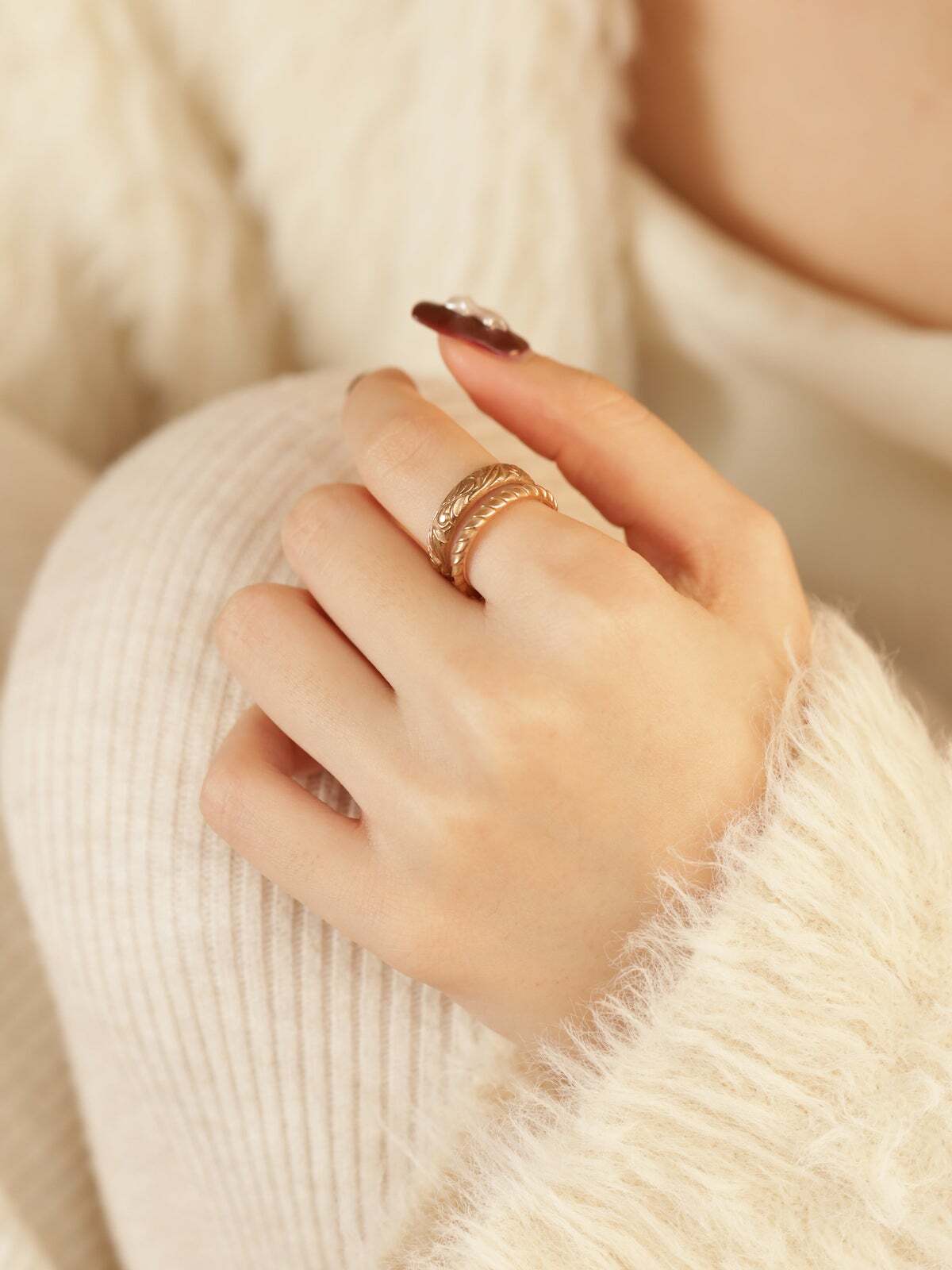 太めのリングにはハワイアンの彫りが上品に施してあり、一方で細めのリングにはシンプルな縄模様でよりなオシャレな手元を演出....