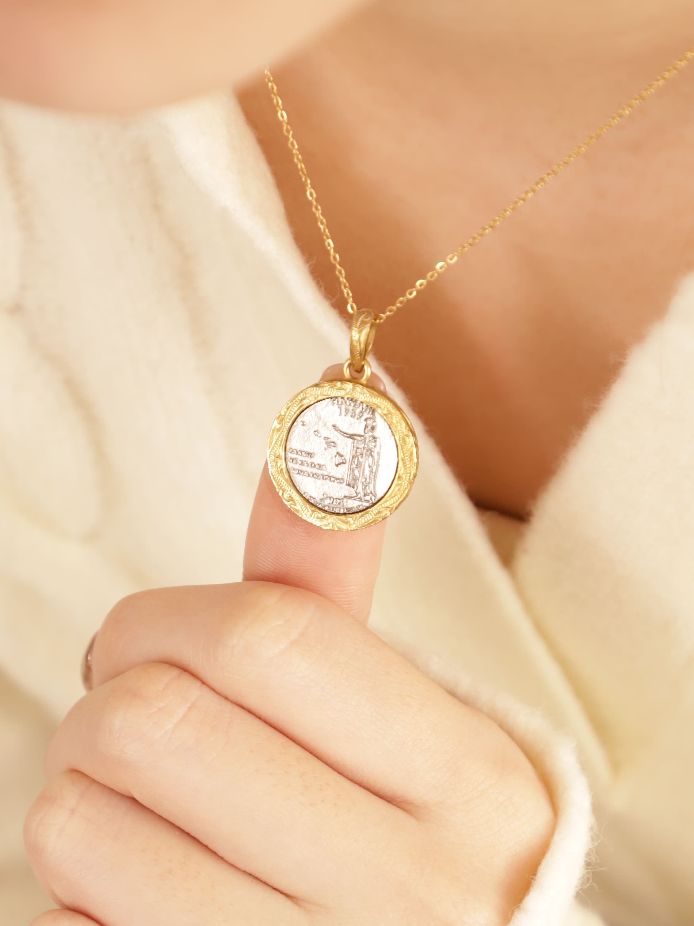 コインの模様はアメリカ合衆国で2008年に発行された貴重なハワイ州25¢硬貨をモチーフにしたネックレス