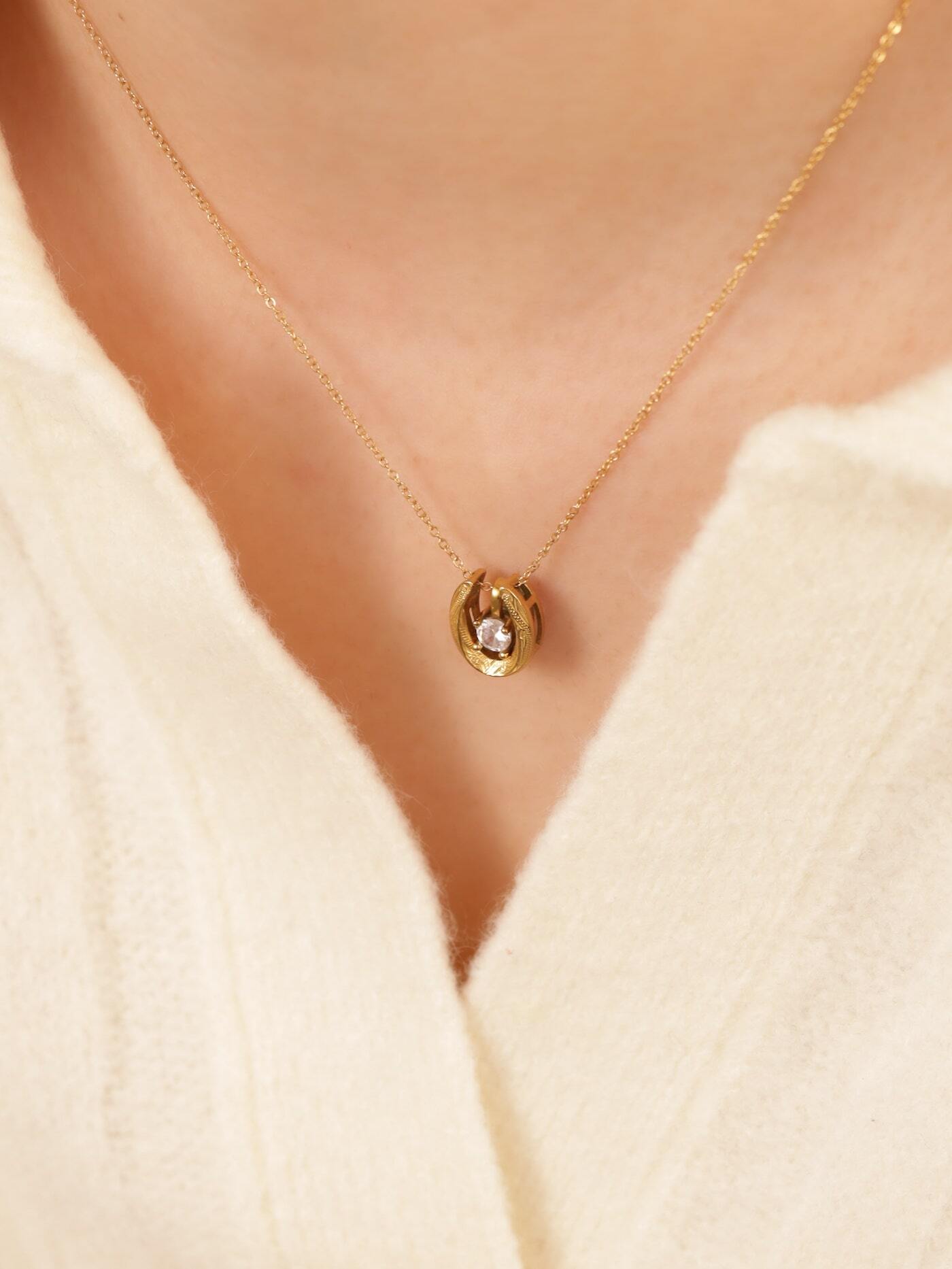 「幸せを溜め込む」という言い伝えのある馬蹄をモチーフにハワイアン柄を彫った上品な輝きがあるネックレスになります