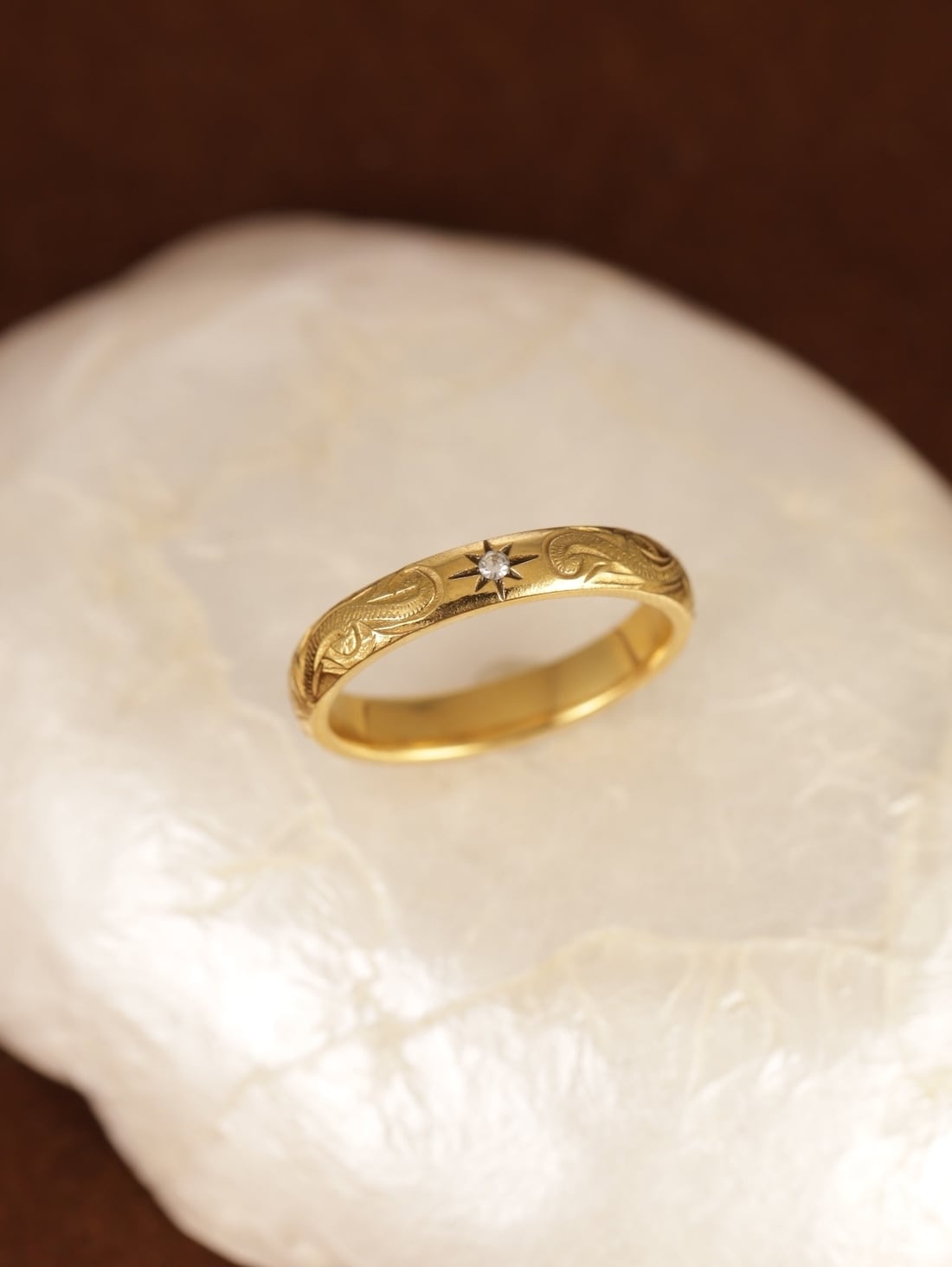 ハワイの伝統模様であるプルメリアとスクロールを彫った細身で上品なリングになります。