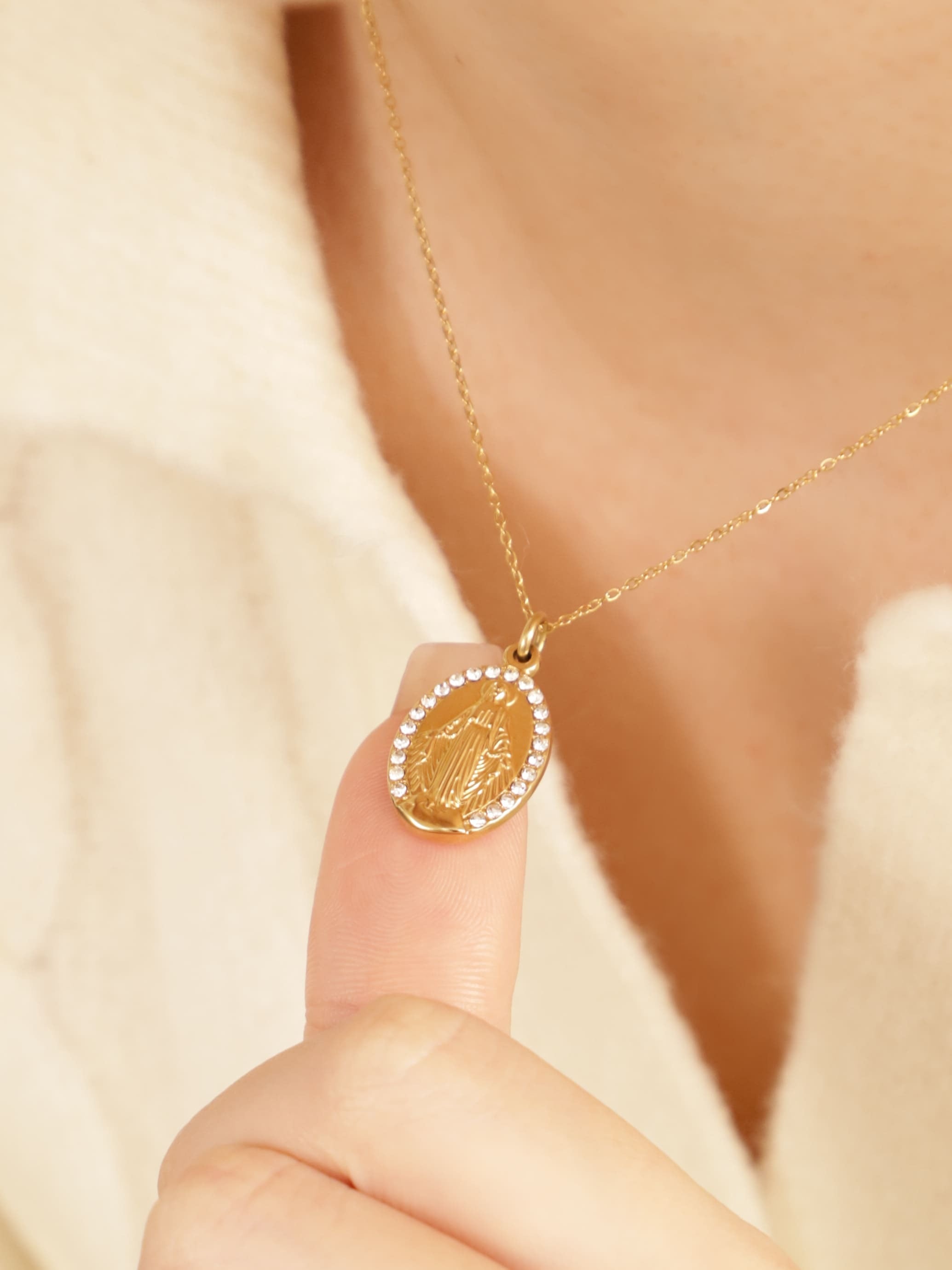 聖母マリアが刻まれたメダイの周りにジルコニアが施された上品で豪華なネックレス....